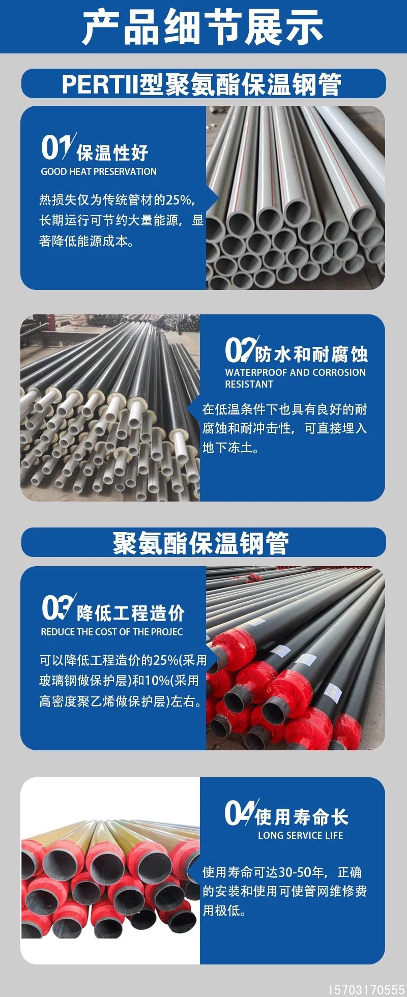 1. **優異的保溫性能**:聚氨酯保溫層導熱係數低,保溫效果顯著,減少了熱量損失。